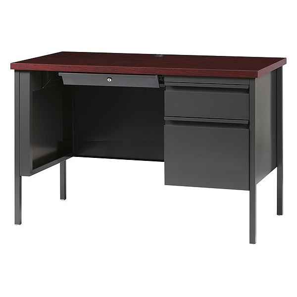 Office Desk, Caster/Glide Diameter Not Applicable, Caster/Glide Type Leveling Glides, Desktop Color Charcoal, Mahogany, Desktop Material Particle Board, Frame Color Charcoal, Mahogany, Frame Material Steel, Includes Client Surface Yes, Includes Keyboard Tray No, Includes Modesty Panel Yes, Number of Cable Holes 1, Number of Casters/Glides 4, Number of Drawers 2, Number of Pedestals 1, Number of Shelves 0, Overall Depth 24 in, Overall Height 29 1/2 in, Overall Width 45 in