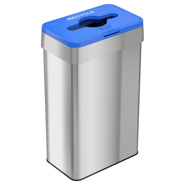21 Gallon Rectangular Recycle Bin with Opening Lid makes it easy to separate compostables from non-compostables quickly and easily in high-traffic venues like cafeterias and hallways. Paired with a 21 Gallon Stainless Steel Rectangular Open Top bin, the lid fits snugly on top of the lid. The universally recognizable. Each lid comes with two removable decals with easy to read text. The lids feature a button release to open the top for easy access.