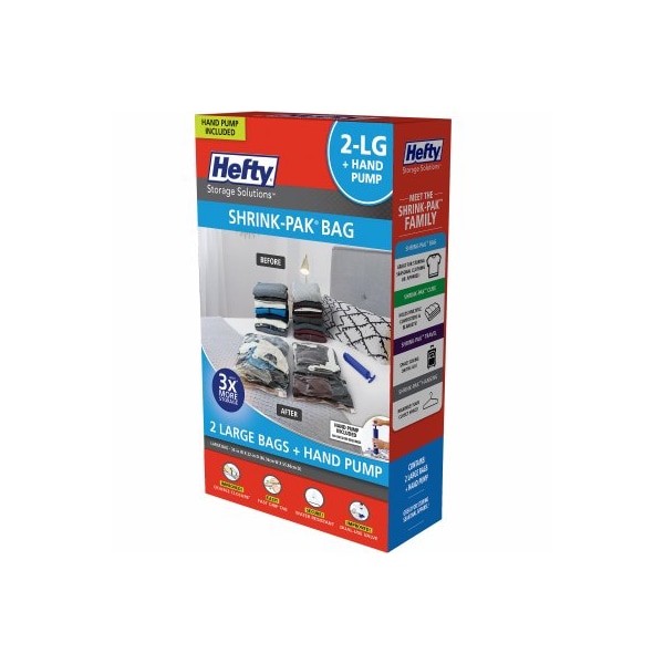 Hefty Shrink Pak Set 2 Large Bags + Hand Pump - durable vacuum storage solution to save space. Set includes 2 large bags measuring 34W x 22 D and a hand pump