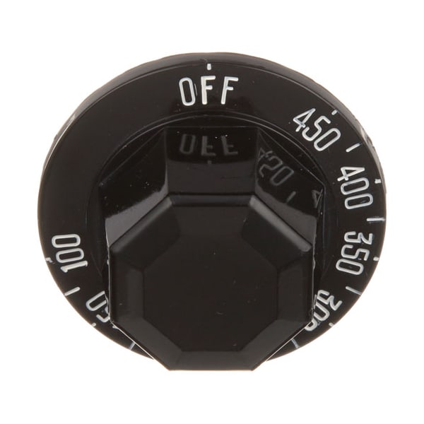 Black T'Stat Knob, White Print, Octagon Grip,;[ 2" Dia ] [ Off-450-100] [Mount .187"] [Flat Down ];For T'Stat Kxa: # 46-1107;For T'Stat Tc125~; # 46-1138;Also Used On T'Stat Kxt~; #46-1235;For Red Knob Use # 22-1167;Wolf;Grill Tmm-(36,36A,36B).