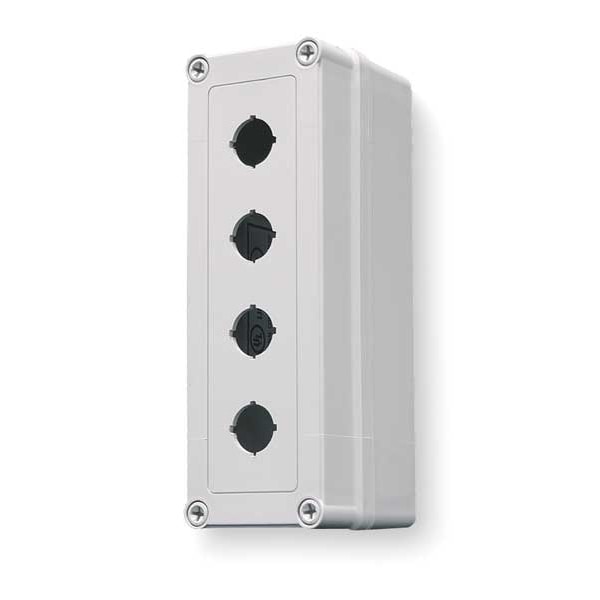 Push Button Enclosure, Number of Columns 1, Number of Holes 4, NEMA Rating 4X, Conduit Size No Conduit Entrance Holes Provided, Dimensions 8.74 in H x 2.84 in W x 3.31 in D, Hole Size 22 mm, Material Polyester, Height 8.74 in, Width 2.84 in, Depth 3.31 in, Color Gray, Includes Cover Corner Screws, Mounting Style -, Standards CSA C22.2 No. 94 File No. E192121, cUL, UL 508A, UL 508A File No. E192121