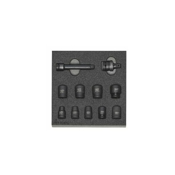 Popular tool sets in two-color PE rigid foam inlays. The closed-pore foam is oil-resistant and does not absorb liquids of any sort. Upper layer is anthracite, the underlying contrast color is grey, thereby indicating any missing tools. Supplied with: Rigid foam inlay, empty No. 952001 size 954015: 1 pc. HOLEX IMPACT hexagon socket, 3/8 inch with magnet No. 650135 size 7, 8, 10, 13, 14, 15, 16, 17, 19: 1 pc. each HOLEX IMPACT extension, 3/8 inch No. 650400 size 100: 1 pc. HOLEX IMPACT universal joint, 3/8 inch No. 650600: 1 pc. Square drive: 3/8 in Width: 200 mm Depth: 200 mm Width in G: 8 Depth in G: 8