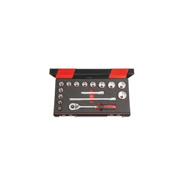 Drives / accessories to DIN 3122 / 3123, sockets to DIN 3124. Internal / external square drives to DIN 3120. With hexagon sockets No. 642120. Application: For hexagon head screws / nuts with thread M6 M22. Material: Chrome vanadium steel, chrome-plated. Supplied with: Sockets: 13 pcs. size 10, 13, 16, 17, 18, 19, 21, 22, 24, 27, 30, 32, 34 mm 2 extensions: No. 641020 size 130, 255 1 ratchet: No. 640190 Storage in: ABS plastic box Height: 62 mm Square drive: 1/2 in Width across flats range, hexagon sockets: 10-34 mm