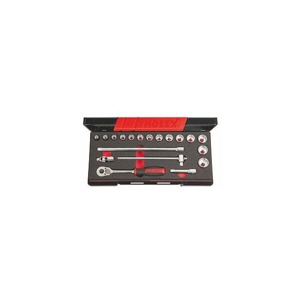 Drives / accessories to DIN 3122 / 3123, sockets to DIN 3124. Internal / external square drives to DIN 3120. With bi-hexagon sockets. Application: For hexagon head screws / nuts with thread M5 M14. Material: Chrome vanadium steel, chrome-plated. Supplied with: Sockets: 14 pcs. size 8, 9, 10, 11, 12, 13, 14, 15, 16, 17, 18, 19, 21, 22 mm T-handle: 1 pc. No. 635720 Extensions: 2 pcs. No. 635420 size 75, 240 Universal joint: 1 pc. No. 636220 Ratchet: 1 pc. No. 635090 Storage in: ABS plastic box Height: 47 mm Square drive: 3/8 in Width across flats range, bi-hex sockets: 8-22 mm