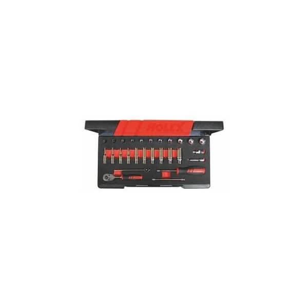Drives and connecting parts to DIN 3122 / 3123. All parts in plastic cases. Material: Chrome vanadium steel, chrome-plated. Supplied with: Sockets single hexagon: 11 pcs. similar to No. 631022 size 5/32, 3/16, 7/32, 1/4, 9/32, 5/16, 11/32, 3/8, 7/16, 1/2, 9/16 inch Hexagon sockets, long: 10 pcs. similar to No. 631417 size 5/32, 3/16, 7/32, 1/4, 9/32, 5/16, 11/32, 3/8, 7/16, 1/2 inch T-handle: 1 pc. similar to No. 633029 Spinner handle: 1 pc. similar to No. 632840 size 150 Extensions: 2 pcs. similar to No. 632420 size 50, 100 Universal joint: 1 pc. similar to No. 633520 Ratchet: 1 pc. similar to No. 632090 Storage: ABS plastic box Height: 66 mm Square drive: 1/4 in Width across flats range, hexagon sockets: 5/32-9/16 in