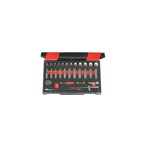 Drives and connecting parts to DIN 3122 / 3123. All parts in plastic cases. Material: Chrome vanadium steel, chrome-plated. Supplied with: Sockets bi-hexagon: 12 pc. similar to No. 637100 Size 1/4, 5/16, 11/32, 3/8, 7/16, 1/2, 9/16, 5/8, 11/16, 3/4, 13/16, 7/8 inch Bi-hex sockets, long: 9 pcs. similar to No. 637322 size 5/16, 11/32, 3/8, 7/16, 1/2, 9/16, 5/8, 11/16, 3/4 inch Sockets for bi-hexagon spark plugs: 2 pcs. similar to No. 637329 size 16, 20.8 Spinner handle: 1 pc. similar to No. 635720 size 200 Extensions: 2 pcs. similar to No. 635420 size 75, 250 Universal joint: 1 pc. similar to No. 636220 Ratchet: 1 pc. similar to No. 635090 Storage: ABS plastic box Height: 84 mm Square drive: 3/8 in Width across flats range, bi-hex sockets: 1/4-7/8 in