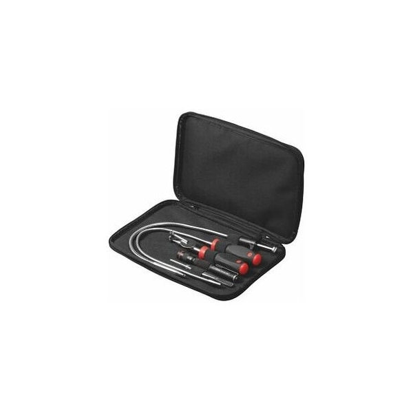 Perfectly matched inspection set ideal for maintenance in places where access is difficult. The tools are packed in a robust case which can be washed down with a zip fastener and loop for secure storage. Supplied with: LED pen torch: 1x No. 081461 size PEN Claw retriever: 1x No. 081610 size 500 Magnetic retriever: 1x No. 081670 size 500 Telescopic inspection mirror: 1x No. 081630 size 30 Tweezers with flat blunt nose, straight: 1x No. 727550 size N Storage in: Case 300x200 mm