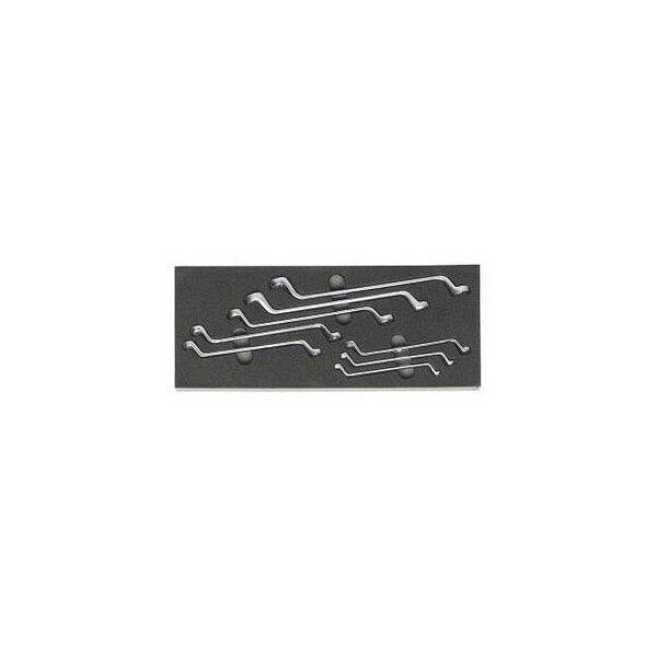 Popular tool sets in two-color moulded PE rigid foam inlays. The closed-pore foam is oil-resistant and does not absorb liquids of any sort. Upper layer is anthracite, the underlying contrast color is grey, thereby indicating any missing tools. Supplied with: Rigid foam inlay, empty No. 952001 size 952445: 1 pc. GARANT double-ended ring wrench deep cranked no. 615950 size 6x7, 8x9, 10x11, 12x13, 14x15, 16x17, 18x21, 19x22: 1 pc. each Degree of fill of a drawer in units: 8x20 Width: 200 mm Depth: 500 mm Width in G: 8 Depth in G: 20