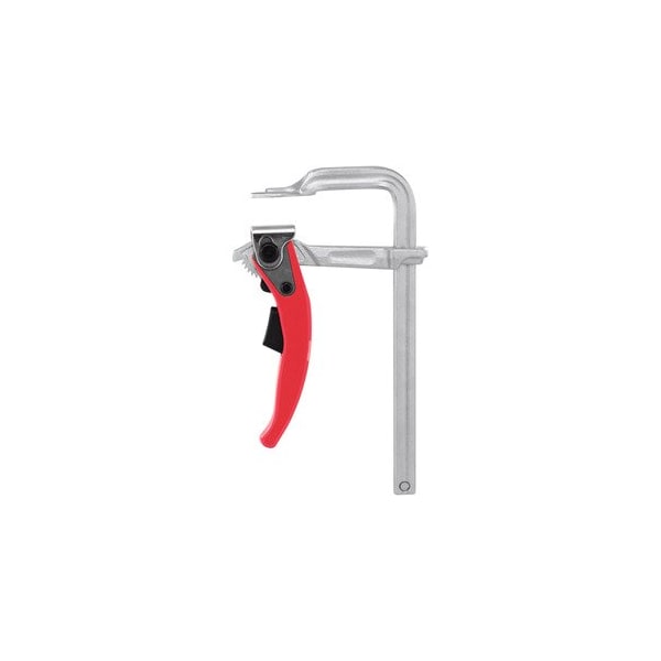 All-steel Lever Clamp, Jaw Capacity: 120mm. Version: Beam / fixed jaw made of bright drawn steel- moving jaw of forged steel- each hardened and electro galvanized. Clamping lever with self-locking ratchet clamping mechanism. Opens by releasing the ratchet. Movable pressure pad- clamping lever powder coated. Application: For fast and easy clamping with high clamping pressure. Cross section of the slide rail: 13.5x6.5 mm Throat: 60 mm Weight: 0.5 kg