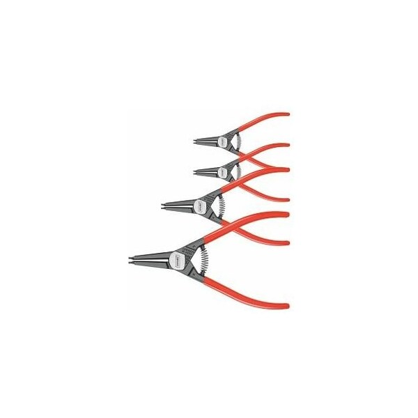 Drop forged from a single piece of steel, plastic coated handles. Standard: DIN 5254 A gerade Backen, fr Auensicherungsringe. Supplied with: 1 each circlip pliers No. 719905 size A0, A1, A2, A3. Use of circlip pliers: Outer ring, straight for external circlip : 3 10, 10 25, 19 60, 40 100 mm Tip : 0.9, 1.3, 1.8, 2.3, mm maximum overall length: 135, 135, 180, 225 mm