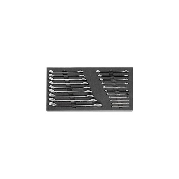 Combination wrench set in Heavy Duty Foam, 20 Pc. Version: Popular tool sets in two-color molded PE rigid foam inlays. The closed-pore foam is oil-resistant and does not absorb liquids of any sort. Upper layer is anthracite- the underlying contrast color is grey- thereby indicating any missing tools. Supplied with: Rigid foam inlay- empty No. 952001 size 952505: 1 pc. HOLEX combination wrench No. 613950 size 5.5- 6- 7- 8- 9- 10- 11- 12- 13- 14- 15- 16- 17- 18- 19- 20- 21- 22- 24- 27: 1 pc. each Smallest suitable drawer front height: 100 mm Width: 250 mm Depth: 500 mm Width in G: 10 Depth in G: 20