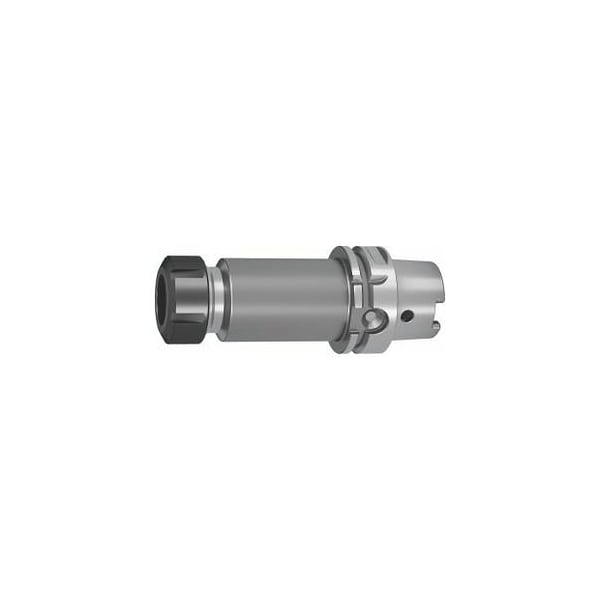 With Balluff/RFID chip bore. All shanks hard turned for smooth running!. Through bored without adjustment screw. HSK mating faces machined. Application: For clamping tools with plain shanks in ER collets to DIN 6499 Form A and B. Supplied with: Coated High-Speed clamping nut. Optional extras: Coolant tube No. 309880, socket wrench for coolant tubes No. 309890, ER collets No. 308881 309434, ER chuck key No. 309680 or 613300. Clamping range: 2 20 mm Overhang dimension A: 130 mm External Dia D: 50 mm