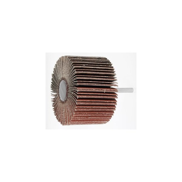 Flap wheel for stainless steel- 80 grit- Head diameterxhead width: 60X30mm. Version: Flap strips bonded on to the shank of the tool. Abrasive strips covered with Aluminum Oxide A. With active abrasive bonding for stainless steels Application: Primarily for finish grinding and polishing tasks on larger radii in tool and mold making- for vessel and machine fabrication. The abrasive strips adapt to the contours of the component. Grinding medium code: A Shank Dia: 6 mm recommended speed: 8000 min-1 maximum speed: 12700 min-1