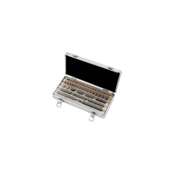 Gage Block Set, 47 Pc. Version: Made of aged special steel. Hardened HRC 64 - 66 with slightly beveled edges. Lapped gauge faces. With free test certificate traceable to national standards: Each gauge block is provided with its own unique identity number. The actual deviation from the nominal dimensions is recorded in the test certificate. The absolute actual dimension is therefore known. Tolerance class 1 for checking standards and gauges. Content: 1x each of size: 1.005 mm Graduation 0.01: 21 pcs. 1.00 - 1.20 mm Graduation 0.1: 8 pcs. 1.3 - 2.0 mm Graduation 1.0: 8 pcs. 3.0 - 10 mm Graduation 10.0: 9 pcs. 20 - 100 mm