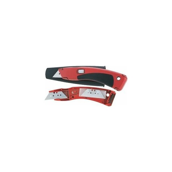 Sturdy handle of die-cast zinc, powder-coated, with 5 blades of special steel stored in the handle. With fixed blade, in storage case with belt clip. Knife can be opened without tools, with magnetic blade mounting and spare blades storage in the handle. Ergonomic 2-component handle. overall length: 170 mm Number of blades: 5