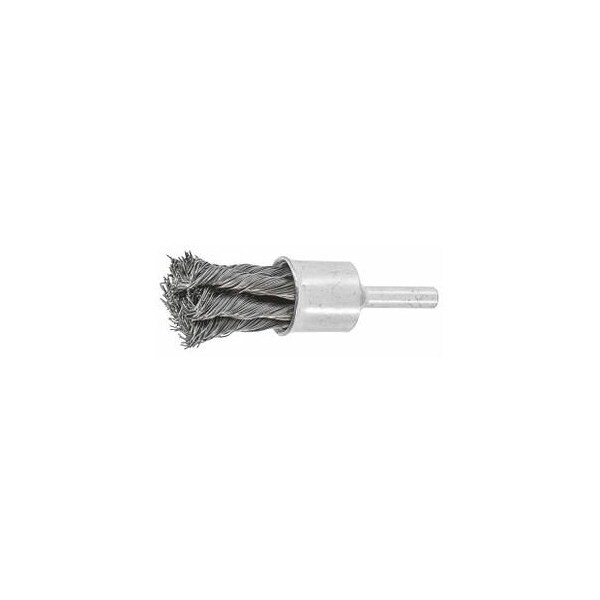 Smooth, knotted wire, crimped into steel ferrule, shank 6 mm, even density, extremely wear-resistant. Application: For deburring, removing paint, and for all moderate to heavy brushing jobs. As speed increases the brush opens, this allows it to be introduced even into tight spaces, e.g. when brushing the inside of casings. Brush D1: 19 mm Length of brush section H1: 28 mm Number of twisted knots: 6 maximum speed: 20000 min-1