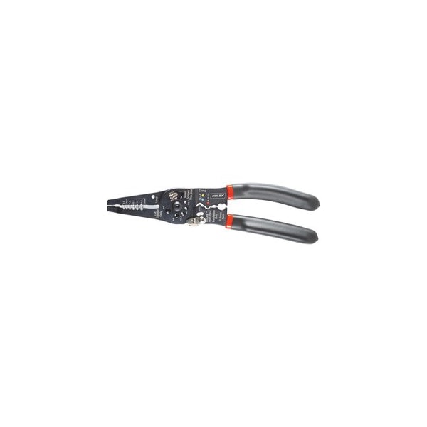 Pliers body made of flat steel- painted black- legs with plastic grips and opening spring. Crimps for 0.35 1- 1.5 6 insulated / uninsulated plugs / connectors and 7 8 mm car ignition terminals. Threaded cutter for bolts M2.6 - M5. Wire stripper 0.5 - 6 mm2. Cutting for soft Cu and Al wires. Long serrated clamping nose for working in confined spaces. Application: For stripping- cutting- compressing etc.- primarily for repair work. overall length: 225 mm for conductor cross-section: 1.5 6 mm2 for conductor cross-section: 0.35 1 mm2 Wire stripping for conductor : 6 mm2
