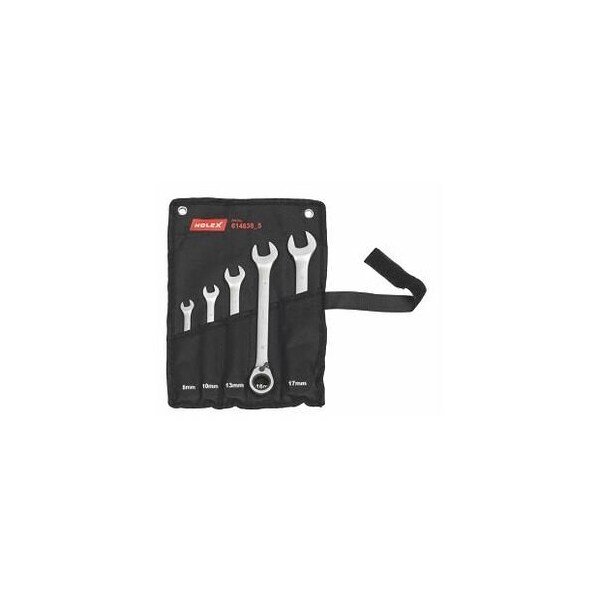 With particularly free-running sturdy ratchet at each end reversible for left and right hand tightening. The 2 ends have different widths across flats. Extremely small working arc of 5 Deg. In a handy textile tool roll. Material: Chrome vanadium steel, matte chrome-plated. Supplied with: 1 each wrench No. 614828 in sizes 8, 10, 13, 16, 17.