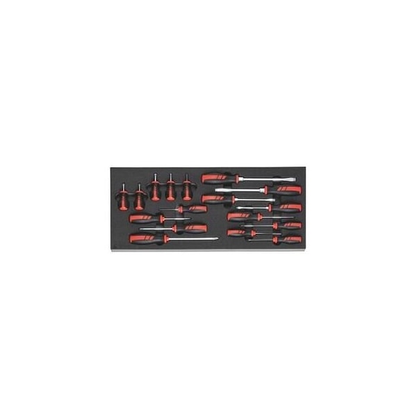 Popular tool sets in two-color moulded PE rigid foam inlays. The closed-pore foam is oil-resistant and does not absorb liquids of any sort. Upper layer is anthracite, the underlying contrast color is grey, thereby indicating any missing tools. Supplied with: Rigid foam inlay, empty No. 952001 size 953551: 1 pc. HOLEX slot-head screwdriver No. 660701 size 2.5, 3, 3.5, 4, 5.5, 7, 8, 10: 1 pc. each HOLEX short screwdriver for slot-head No. 664201 size 4, 5.5, 6.5: 1 pc. each HOLEX screwdriver for Phillips No. 668401 size 0, 1, 2, 3: 1 pc. each HOLEX stub screwdriver for Phillips No. 668471 size 1, 2: 1 pc. each Degree of fill of a drawer in units: 10x24 Width: 250 mm Depth: 600 mm Width in G: 10 Depth in G: 24