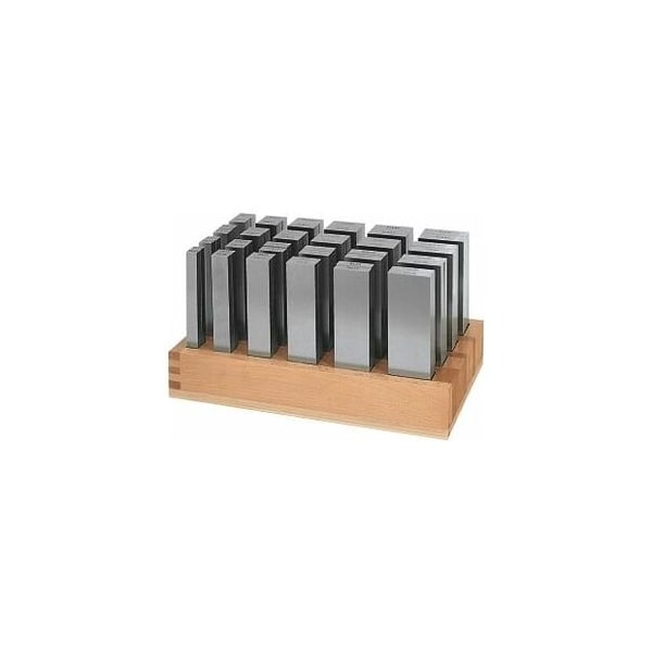 HOLEX standard version. Height and pairing tolerance 0.01 mm. Stored in a wooden box as shown on the illustration. Hardness: 60 HRC. Precision ground as pairs. Application: In high precision work for parallel mounting of components in machine vices or jigs. Content: 8x11, 8x16, 8x21, 8x26, 8x31, 8x36, 10x13, 10x18, 10x23, 10x28, 10x33, 10x38, 12x15, 12x20, 12x25, 12x30, 12x35, 12x40, 14x17, 14x22, 14x27, 14x32, 14x37, 14x42 Note: Sizes 125 - 200: In 1 mm increments, except 9 mm, all other dimensions achievable. See the spare parts list for spare holders. Number of strips: 24 pair Length: 150 mm