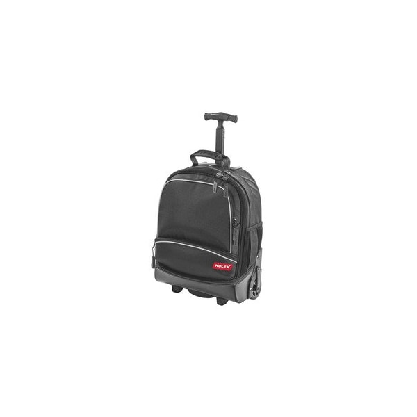 Rolling Tool Backpack with Telescopic Handle. Version: High-quality tool textile bags as a companion for your day-to-day tasks. With reflector strips for good visibility. The backpack trolley can be easily pulled and carried on the back- both via the telescopic handle and the integrated wheels. The wheels can be covered with a protective cover- which prevents any dirt coming loose during carrying. The adjustable non-slip and stow-away shoulder straps with padding ensure pleasant wearing comfort. With carrying handle- zip fastener and feet. Internal: The backpack trolley has 2 removable tool boards which can be configured on both sides with 16 shaft pockets- 16 elastic straps and a padded compartment with that can be closed with a hook and loop fastener for a laptop up to 15 inches. There is also a large zip fastener compartment inside- which provides further storage space. External: 2 front pockets with zip fasteners. Additionally 2 side shaft pockets. Material: Made from sturdy polyester fabric. Type of tool storage: Shaft pockets External dimension length: 360 mm External dimension width: 215 mm External dimension height: 480 mm Weight: 4.25 kg