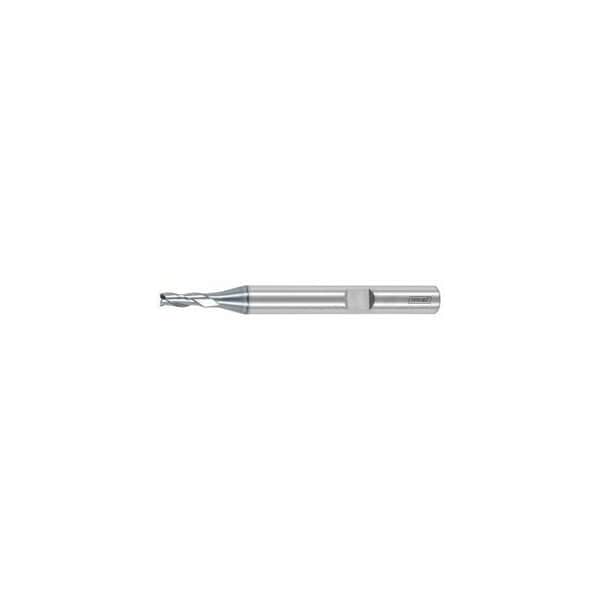 Dimensions similar to DIN 6527. Improved coating for general-purpose applications in steel and cast iron. Through-coolant: no Tolerance nominal Dia. e8 No. of teeth Z: 3 Helix angle: 30 degrees Direction of infeed: horizontal, oblique and vertical Shank: DIN 6535 HB to h6 No. of teeth Z: 3 Flute length Lc: 13 mm Overall length L: 57 mm Shank Dia. Ds: 6 mm Corner chamfer width at 45 Deg: 0.2 mm Feed fz for slot milling in steel < 750 N/mm2: 0.03 mm
