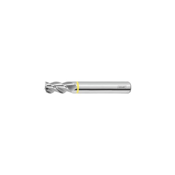Eccentric relief ground- additionally finish ground in the flutes for outstanding chip evacuation in long-chipping aluminium workpieces. Application: For roughing and finishing. Through-coolant: no Tolerance nominal dia : e8 No. of teeth Z: 3 Helix angle: 45 Deg Direction of infeed: horizontal- oblique and vertical Shank: DIN 6535 HA to h6 No. of teeth Z: 3 Flute length Lc: 10 mm Overall length L: 57 mm Shank dia Ds: 6 mm Feed fz for slot milling in short-chipping aluminium: 0.015 mm Feed fz for side milling in short-chipping aluminium: 0.02 mm
