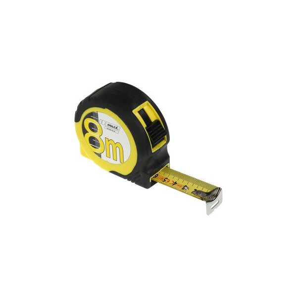 Plastic casing with removable belt clip. Automatic tape return and stop- with damping effect. Sliding end hook. Tape measure printed black/red on yellow. Standard: EG II Tape width: 25 mm Body length: 80 mm Body width: 35 mm Body height: 75 mm