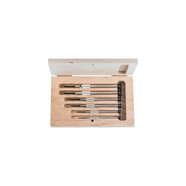 End of handle with rotating hexagonal head allowing precision work. Corrosion-resistant aluminium handle, with fixed pressed-in blade. Application: For slot head screws Standard: hnlich DIN 8320 Material: Bits made of special steel. Content: 1 pc. each watchmakers screwdriver, slot head: 1 pc. each 1, 1.5, 1.8, 2.3, 3.0, 3.5 mm