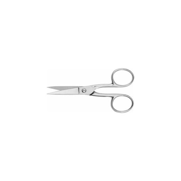 Scissors with a handy but still robust design, surface nickel-plated. Application: For cutting paper, fabric, threads, cords, etc.