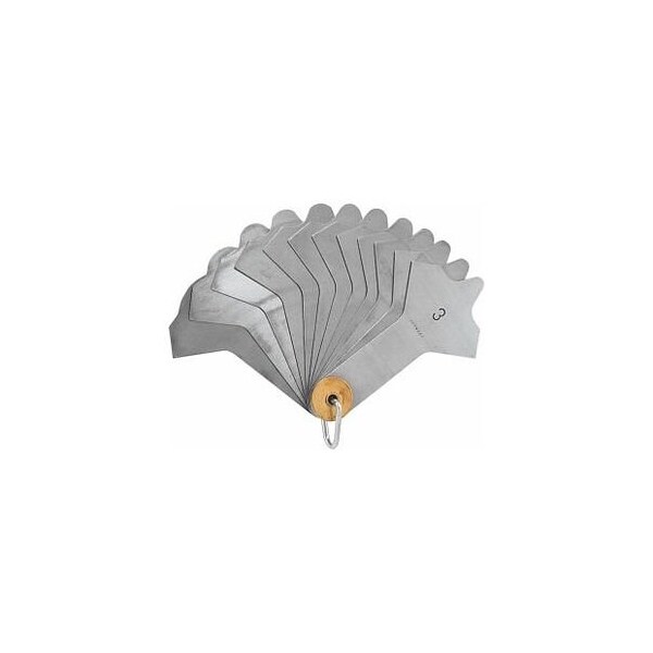 12 blades, held fan-shaped by a ring 3 / 3.5 / 4 / 4.5 / 5 / 5.5 / 6 / 6.5 / 7 / 8 / 10 / 12 mm. Application: For checking welding seams in right-angled corners.