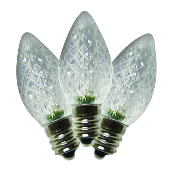 Our faceted C7 bulbs feature patented raised SMD LED technology, which allows for greater illumination of the entire bulb cap. A patented voltage controlled resistor helps increase longevity and consistency, without fluctuation of brightness. Our faceted C7 bulbs feature a beveled LED chip, which distributes the light evenly through the bulb. UV protected for 5 seasons.