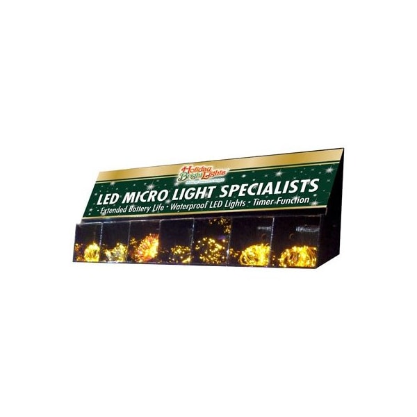 36W x 10T x 8D Shiny Black Micro Light Top Displayer Has 4 Boxes That Hold 4 Different Micro Lights To Display On Top Of End Cap Made Of Cardboard.
