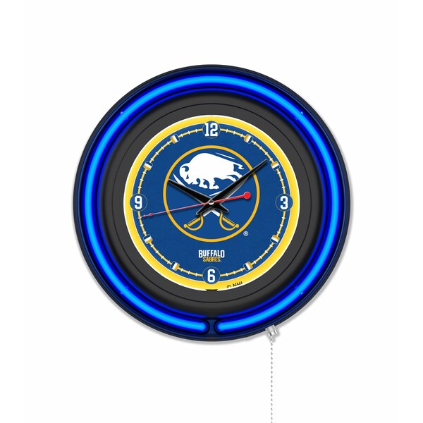 Our double neon Logo Clocks are the perfect way to show your team pride. Featuring a Black casing and a team color specific neon outer ring that accents the custom printed clock face which is lit up by an brilliant white, inner neon ring. The Neon rings are easily turned on and off with a pull chain on the bottom of the clock, and are powered by a UL Listed power transformer that runs off standard 120V outlet. Accurate quartz movement ensures proper time and is powered by a single, AA battery not included. Whether purchasing as a gift for a sports super fan, or for yourself, you can take satisfaction knowing you're buying a clock that is proudly made by the Holland Bar Stool Company in Holland, MI