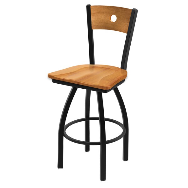 Customize your very own counter stool with the help of the Holland Bar Stool Co. This Black Wrinkle Voltaire swivel counter stool has a contemporary design featuring a stylish wood back available with a natural or medium finish. The frame is made from commercial quality 16 gauge, 1 1/4 inch tube steel with solid mig welded joints to guarantee strength and durability. The powder coated finish resists chips and scratches and ensures a long-lasting, rich appearance. The wood seats are 1 1/4 inch solid hardwood and are dished for amazing posterior comfort, making sitting for minutes or hours a pleasure. The cushion seats are of the highest quality as well, utilizing a breathable, commercial grade vinyl or fabric. At the heart of the cushion is 2 1/2 inches of highly-dense foam that provides maximum support and will not breakdown in a couple years. You won't find a higher quality stool on the market. If you are going to finish your bar or dining area - do it right, with a stool from the Holland Bar Stool Co.