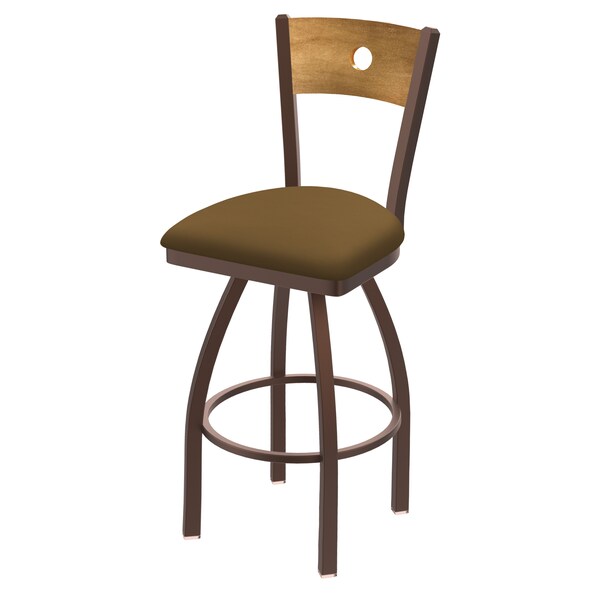 Customize your very own bar stool with the help of the Holland Bar Stool Co. This Bronze Voltaire swivel bar stool has a contemporary design featuring a stylish wood back available with a natural or medium finish. The frame is made from commercial quality 16 gauge, 1 1/4 inch tube steel with solid mig welded joints to guarantee strength and durability. The powder coated finish resists chips and scratches and ensures a long-lasting, rich appearance. The wood seats are 1 1/4 inch solid hardwood and are dished for amazing posterior comfort, making sitting for minutes or hours a pleasure. The cushion seats are of the highest quality as well, utilizing a breathable, commercial grade vinyl or fabric. At the heart of the cushion is 2 1/2 inches of highly-dense foam that provides maximum support and will not breakdown in a couple years. You won't find a higher quality stool on the market. If you are going to finish your bar or dining area - do it right, with a stool from the Holland Bar Stool Co.