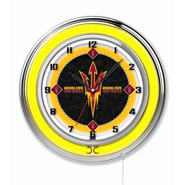 Our double neon Logo Clocks are the perfect way to show your school pride. Featuring a chrome casing and a team color specific neon outer ring that accents the custom printed clock face which is lit up by an brilliant white, inner neon ring. The Neon rings are easily turned on and off with a pull chain on the bottom of the clock, and are powered by a UL Listed power transformer that runs off standard 120V outlet. Accurate quartz movement ensures proper time and is powered by a single, AA battery (not included). Whether purchasing as a gift for a recent grad, sports super fan, or for yourself, you can take satisfaction knowing you're buying a clock that is proudly made by the Holland Bar Stool Company.