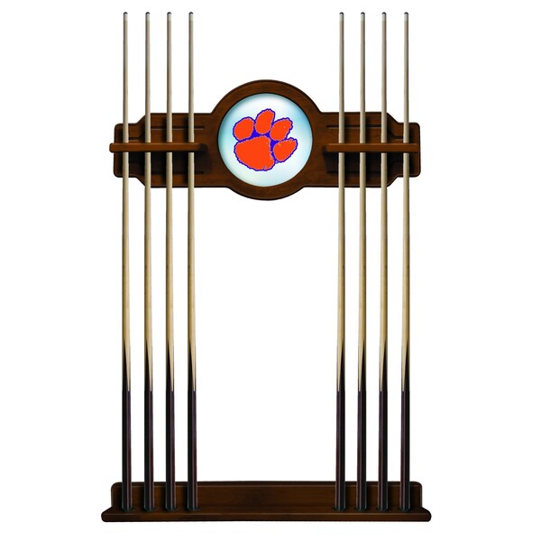 This Officially Licensed Clemson 2 piece Cue Rack by the Holland Bar Stool Co. is a must have accessory for your pool table and game room. Our furniture quality que rack is solid wood, no particle board or veneer like the others in the market. The top section features CNC routed decorative elements and a 10 1⁄2” real mirrored glass center piece that features a first surface digitally UV printed logo, not a sticker like the others. The “shelves” have routed holes that hold the stick in place and won’t damage the cue shaft like inexpensive plastic clips. The bottom section has designated areas for the cue bumper to sit in that are felt lined. The rack features a multi step stain and finish process that ensures a durable yet elegant appearance. Hanging hardware is installed in both top and bottom sections that allow for tight, flush mounting to the wall. The unit comes complete with mounting hardware and instructions. Overall Dimensions: Upper Section: 34" x 14"; Lower Section: 34" x 3 1/2". Finish off your game room with this beautiful Cue Rack from the Holland Bar Stool Co.