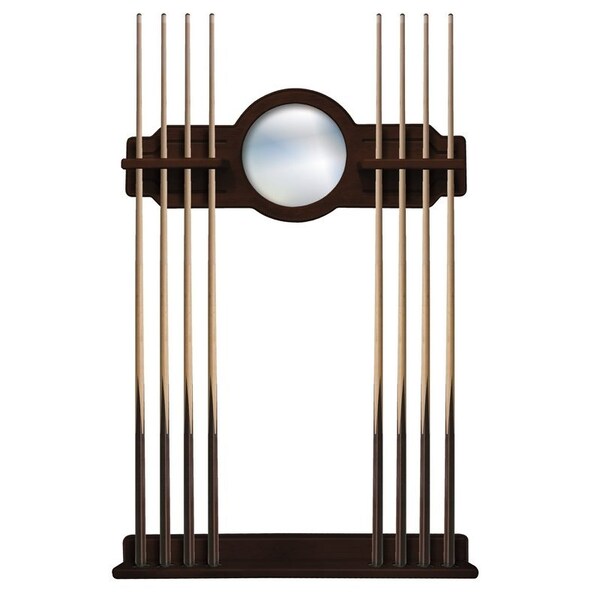 This English Tudor 2 piece Cue Rack by the Holland Bar Stool Co. is a must have accessory for your pool table and game room. Our furniture quality que rack is solid wood, no particle board or veneer like the others in the market. The top section features CNC routed decorative elements and a 10 1⁄2” real mirrored glass center piece that features a first surface digitally UV printed logo, not a sticker like the others. The “shelves” have routed holes that hold the stick in place and won’t damage the cue shaft like inexpensive plastic clips. The bottom section has designated areas for the cue bumper to sit in that are felt lined. The rack features a multi step stain and finish process that ensures a durable yet elegant appearance. Hanging hardware is installed in both top and bottom sections that allow for tight, flush mounting to the wall. The unit comes complete with mounting hardware and instructions. Overall Dimensions: Upper Section: 34" x 14"; Lower Section: 34" x 3 1/2". Finish off your game room with this beautiful Cue Rack from the Holland Bar Stool Co.