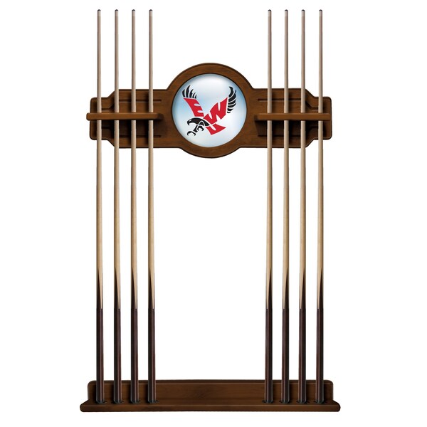This Officially Licensed Eastern Washington 2 piece Cue Rack by the Holland Bar Stool Co. is a must have accessory for your pool table and game room. Our furniture quality que rack is solid wood, no particle board or veneer like the others in the market. The top section features CNC routed decorative elements and a 10 1⁄2” real mirrored glass center piece that features a first surface digitally UV printed logo, not a sticker like the others. The “shelves” have routed holes that hold the stick in place and won’t damage the cue shaft like inexpensive plastic clips. The bottom section has designated areas for the cue bumper to sit in that are felt lined. The rack features a multi step stain and finish process that ensures a durable yet elegant appearance. Hanging hardware is installed in both top and bottom sections that allow for tight, flush mounting to the wall. The unit comes complete with mounting hardware and instructions. Overall Dimensions: Upper Section: 34" x 14"; Lower Section: 34" x 3 1/2". Finish off your game room with this beautiful Cue Rack from the Holland Bar Stool Co.