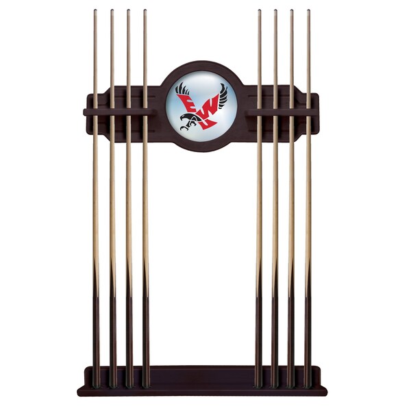 This Officially Licensed Eastern Washington 2 piece Cue Rack by the Holland Bar Stool Co. is a must have accessory for your pool table and game room. Our furniture quality que rack is solid wood, no particle board or veneer like the others in the market. The top section features CNC routed decorative elements and a 10 1⁄2” real mirrored glass center piece that features a first surface digitally UV printed logo, not a sticker like the others. The “shelves” have routed holes that hold the stick in place and won’t damage the cue shaft like inexpensive plastic clips. The bottom section has designated areas for the cue bumper to sit in that are felt lined. The rack features a multi step stain and finish process that ensures a durable yet elegant appearance. Hanging hardware is installed in both top and bottom sections that allow for tight, flush mounting to the wall. The unit comes complete with mounting hardware and instructions. Overall Dimensions: Upper Section: 34" x 14"; Lower Section: 34" x 3 1/2". Finish off your game room with this beautiful Cue Rack from the Holland Bar Stool Co.