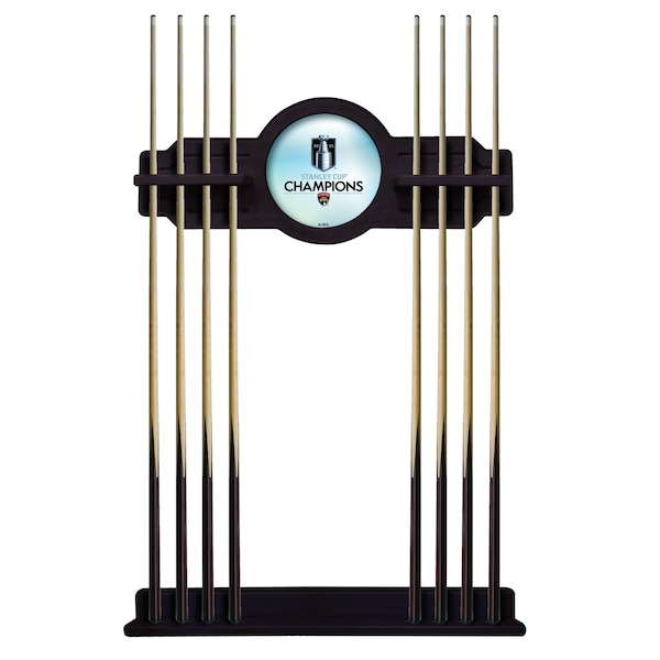 Celebrate the 2025 Stanley Cup Champs, the Florida Panthers with this Officially Licensed, 2 piece Cue Rack by the Holland Bar Stool Co. This is a must have accessory for your pool table and game room. Our furniture quality que rack is solid wood, no particle board or veneer like the others in the market. The top section features CNC routed decorative elements and a 10 real mirrored glass center piece that features a first surface digitally UV printed logo, not a sticker like the others. The shelves have routed holes that hold the stick in place and wont damage the cue shaft like inexpensive plastic clips. The bottom section has designated areas for the cue bumper to sit in that are felt lined. The rack features a multi step stain and finish process that ensures a durable yet elegant appearance. Hanging hardware is installed in both top and bottom sections that allow for tight, flush mounting to the wall. The unit comes complete with mounting hardware and instructions. Overall Dimensions: Upper Section: 34'' x 14''; Lower Section: 34'' x 3 1/2''. Finish off your game room with this beautiful Cue Rack from the Holland Bar Stool Co.