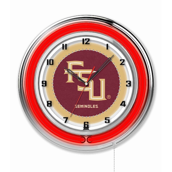 Our double neon Logo Clocks are the perfect way to show your school pride. Featuring a chrome casing and a team color specific neon outer ring that accents the custom printed clock face which is lit up by an brilliant white, inner neon ring. The Neon rings are easily turned on and off with a pull chain on the bottom of the clock, and are powered by a UL Listed power transformer that runs off standard 120V outlet. Accurate quartz movement ensures proper time and is powered by a single, AA battery (not included). Whether purchasing as a gift for a recent grad, sports super fan, or for yourself, you can take satisfaction knowing you're buying a clock that is proudly made by the Holland Bar Stool Company.