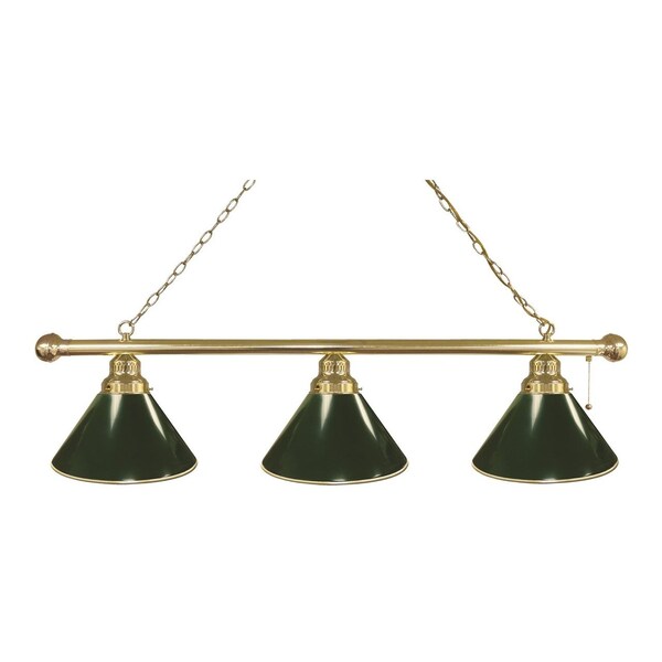 This 3-Shade Billiard Light by Holland Bar Stool is a must have for your game room. Whether above your pool table, game table, or bar, this classic is sure to impress. Measures 54” wide x 14" with shades attached. Features includes On/Off pull chain, 3’ of chain for hanging, ceiling mounting fixture, and 8’ of cord with a 3-pronged polarized plug. Light fixtures are vented to allow heat to escape instead of building around the socket, prolonging bulb life. Decorative molding accent trim on shade rim to match fixture. Lights are UL approved. Brighten up your game room with a classic billiard light from Holland Bar Stool Co.
