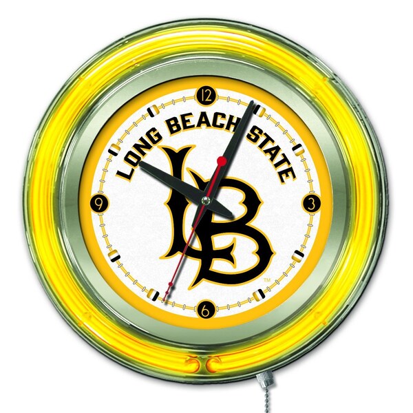 Our double neon Logo Clocks are the perfect way to show your school pride. Featuring a chrome casing and a team color specific neon outer ring that accents the custom printed clock face which is lit up by an brilliant white, inner neon ring. The Neon rings are easily turned on and off with a pull chain on the bottom of the clock, and are powered by a UL Listed power transformer that runs off standard 120V outlet. Accurate quartz movement ensures proper time and is powered by a single, AA battery (not included). Whether purchasing as a gift for a recent grad, sports super fan, or for yourself, you can take satisfaction knowing you're buying a clock that is proudly made by the Holland Bar Stool Company.