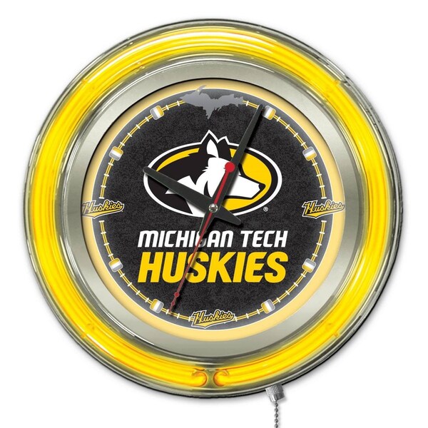 Our double neon Logo Clocks are the perfect way to show your school pride. Featuring a chrome casing and a team color specific neon outer ring that accents the custom printed clock face which is lit up by an brilliant white, inner neon ring. The Neon rings are easily turned on and off with a pull chain on the bottom of the clock, and are powered by a UL Listed power transformer that runs off standard 120V outlet. Accurate quartz movement ensures proper time and is powered by a single, AA battery (not included). Whether purchasing as a gift for a recent grad, sports super fan, or for yourself, you can take satisfaction knowing you're buying a clock that is proudly made by the Holland Bar Stool Company.