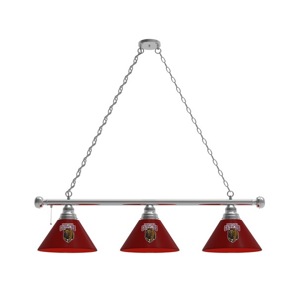 This 3-Shade Billiard Light by Holland Bar Stool is a must have for your game room. Whether above your pool table, game table, or bar, this classic is sure to impress. Measures 54” wide x 14" with shades attached. Features includes On/Off pull chain, 3’ of chain for hanging, ceiling mounting fixture, and 8’ of cord with a 3-pronged polarized plug. Light fixtures are vented to allow heat to escape instead of building around the socket, prolonging bulb life. Decorative molding accent trim on shade rim to match fixture. Lights are UL approved. Brighten up your game room with a classic billiard light from Holland Bar Stool Co.