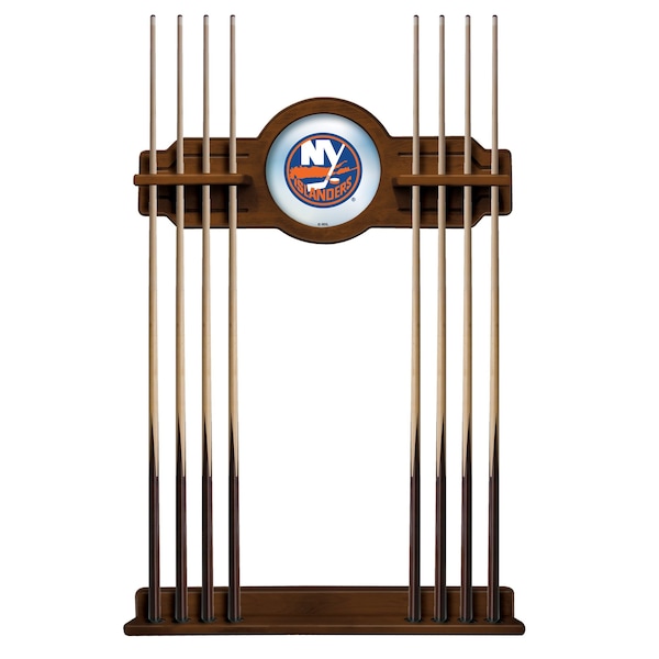 This Officially Licensed New York Islanders 2 piece Cue Rack by the Holland Bar Stool Co. is a must have accessory for your pool table and game room. Our furniture quality que rack is solid wood, no particle board or veneer like the others in the market. The top section features CNC routed decorative elements and a 10 1⁄2” real mirrored glass center piece that features a first surface digitally UV printed logo, not a sticker like the others. The “shelves” have routed holes that hold the stick in place and won’t damage the cue shaft like inexpensive plastic clips. The bottom section has designated areas for the cue bumper to sit in that are felt lined. The rack features a multi step stain and finish process that ensures a durable yet elegant appearance. Hanging hardware is installed in both top and bottom sections that allow for tight, flush mounting to the wall. The unit comes complete with mounting hardware and instructions. Overall Dimensions: Upper Section: 34" x 14"; Lower Section: 34" x 3 1/2". Finish off your game room with this beautiful Cue Rack from the Holland Bar Stool Co.