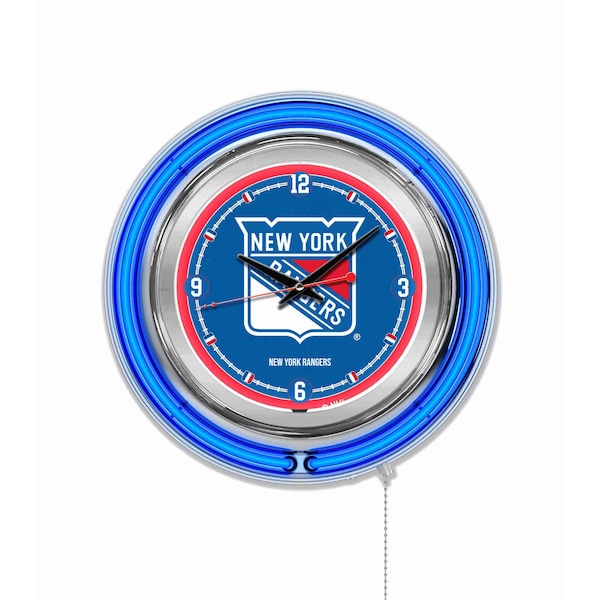 Our double neon Logo Clocks are the perfect way to show your team pride. Featuring a chrome casing and a team color specific neon outer ring that accents the custom printed clock face which is lit up by an brilliant white, inner neon ring. The Neon rings are easily turned on and off with a pull chain on the bottom of the clock, and are powered by a UL Listed power transformer that runs off standard 120V outlet. Accurate quartz movement ensures proper time and is powered by a single, AA battery (not included). Whether purchasing as a gift for a sports super fan, or for yourself, you can take satisfaction knowing you're buying a clock that is proudly made by the Holland Bar Stool Company.