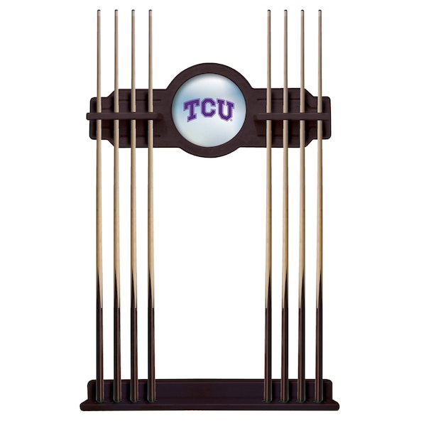 This Officially Licensed TCU 2 piece Cue Rack by the Holland Bar Stool Co. is a must have accessory for your pool table and game room. Our furniture quality que rack is solid wood, no particle board or veneer like the others in the market. The top section features CNC routed decorative elements and a 10 1⁄2” real mirrored glass center piece that features a first surface digitally UV printed logo, not a sticker like the others. The “shelves” have routed holes that hold the stick in place and won’t damage the cue shaft like inexpensive plastic clips. The bottom section has designated areas for the cue bumper to sit in that are felt lined. The rack features a multi step stain and finish process that ensures a durable yet elegant appearance. Hanging hardware is installed in both top and bottom sections that allow for tight, flush mounting to the wall. The unit comes complete with mounting hardware and instructions. Overall Dimensions: Upper Section: 34" x 14"; Lower Section: 34" x 3 1/2". Finish off your game room with this beautiful Cue Rack from the Holland Bar Stool Co.